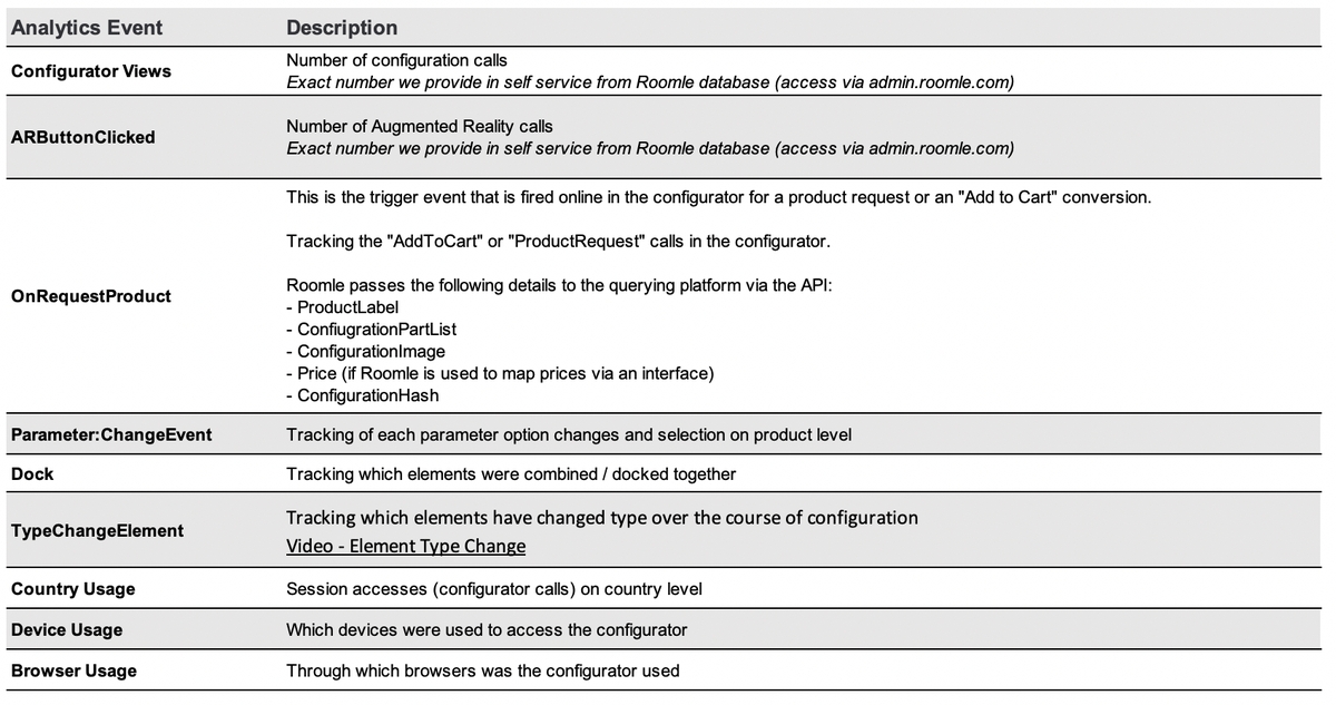 Please find here an overview of the most relevant tracking events that might be of interest for analysing your configurator usage.