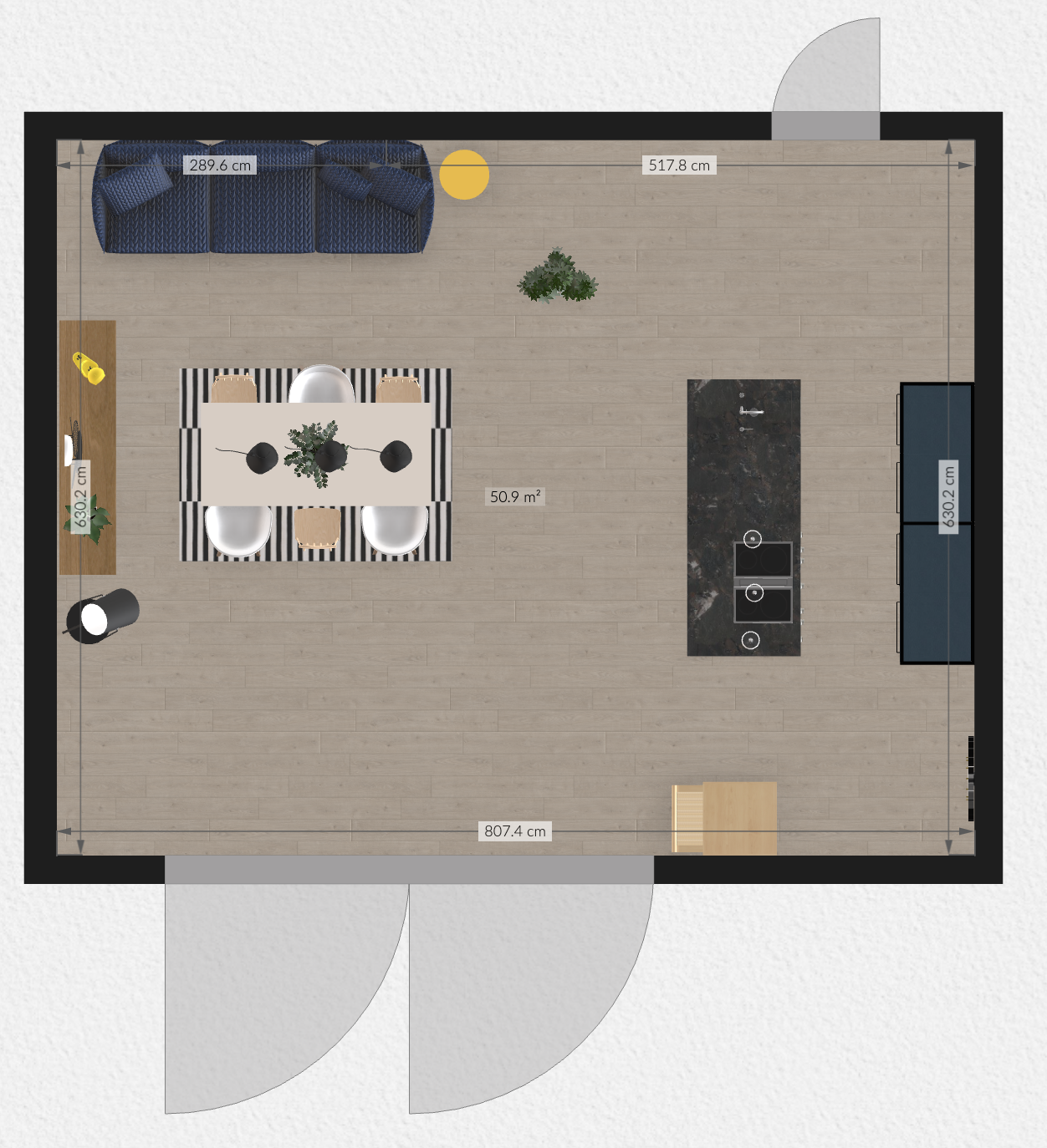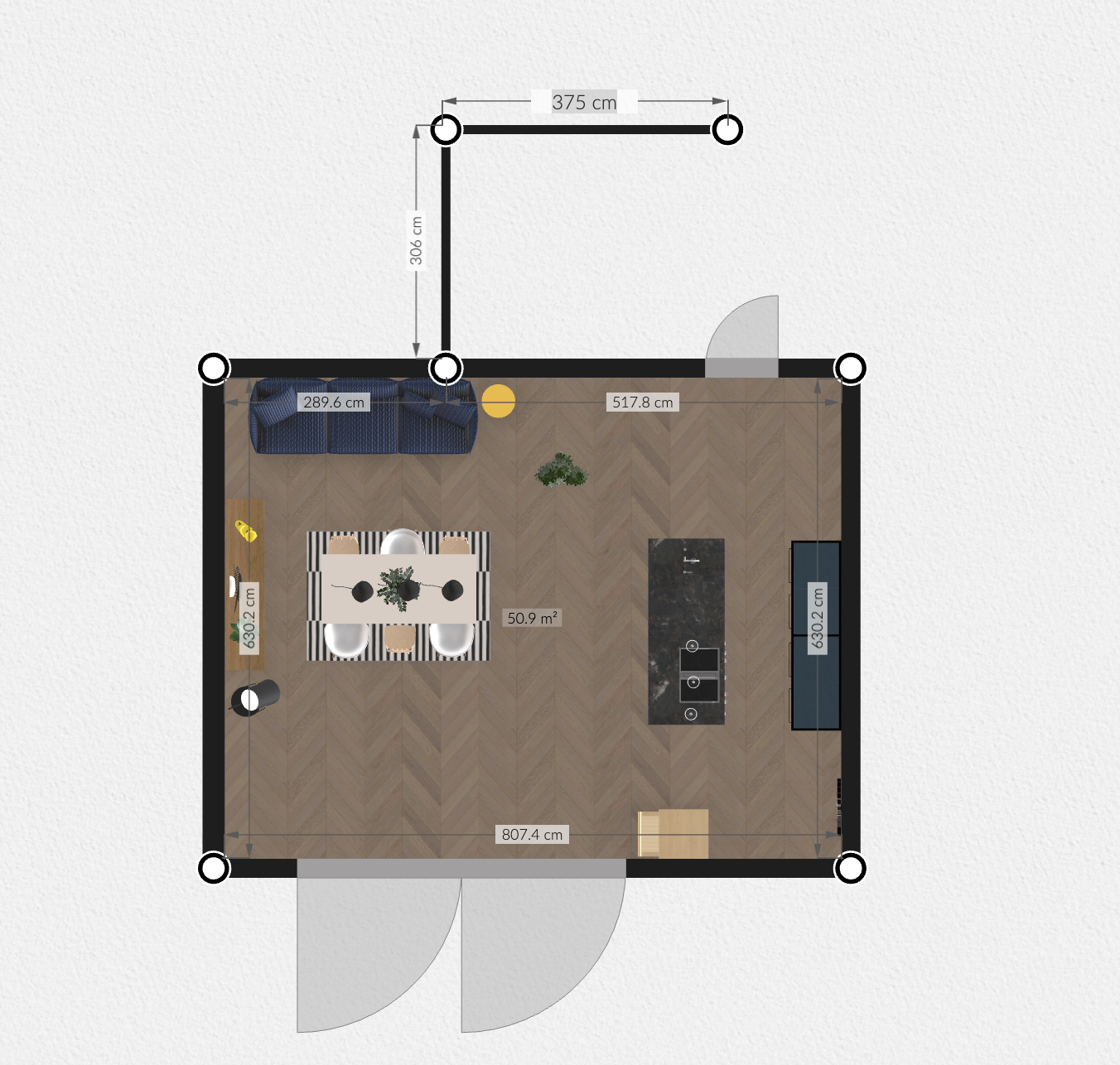 In the past, you could have had overlapping measurement arrows in the corners of the room at certain zoom levels. We now prevent overlapping arrows in 2D mode by always displaying the same distance between the wall and the measurement line.