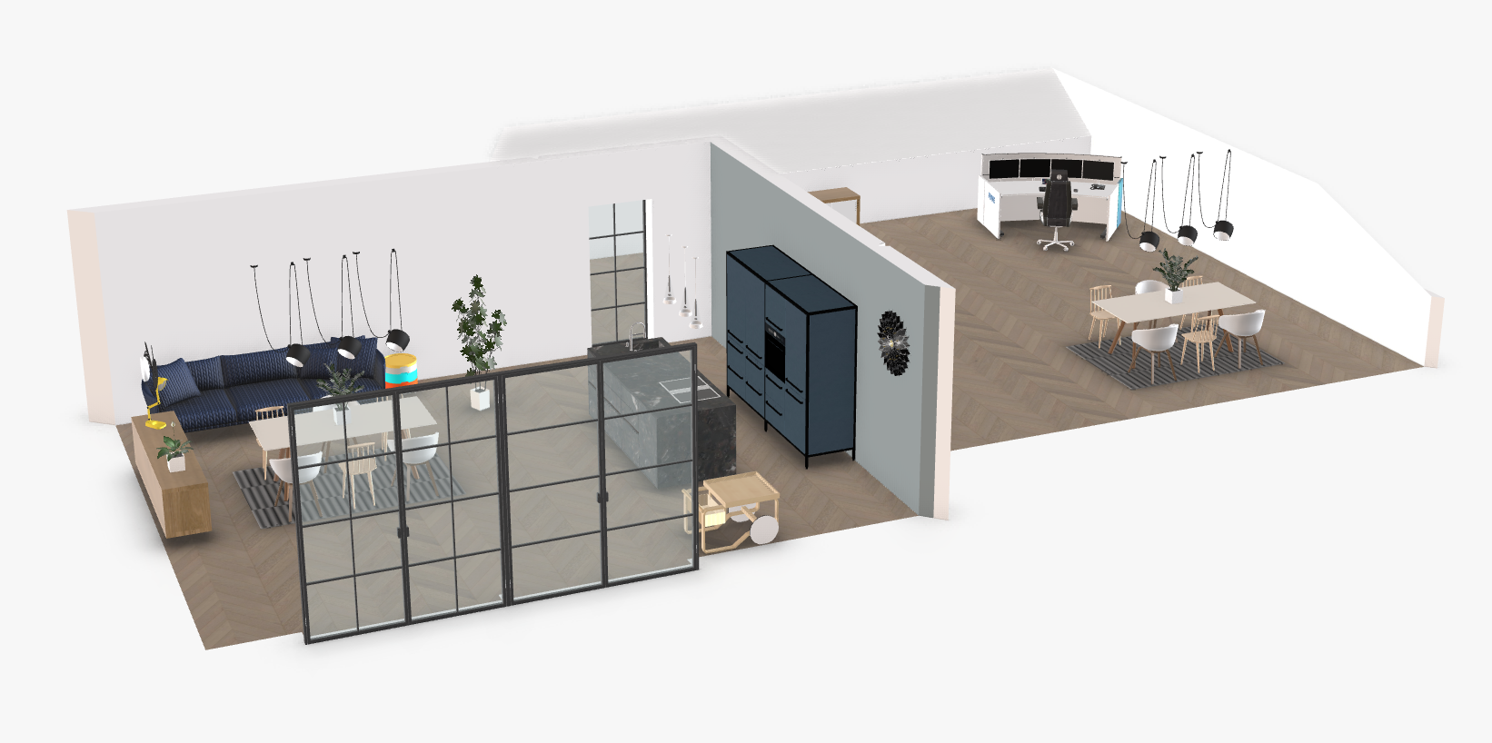 Within the room designer, you can lock plans so that only editing of the catalogue objects is possible. Rooms, floors, and construction elements are not selectable and editable. Also, the general room settings option for globally updating the room is not available. That way, you can create predefined room shapes, forward them to your users or integrate them in your webshop so that the end users can focus on the configuration objects and furnish the rooms without editing them further. Also drawing of new rooms is not possible.