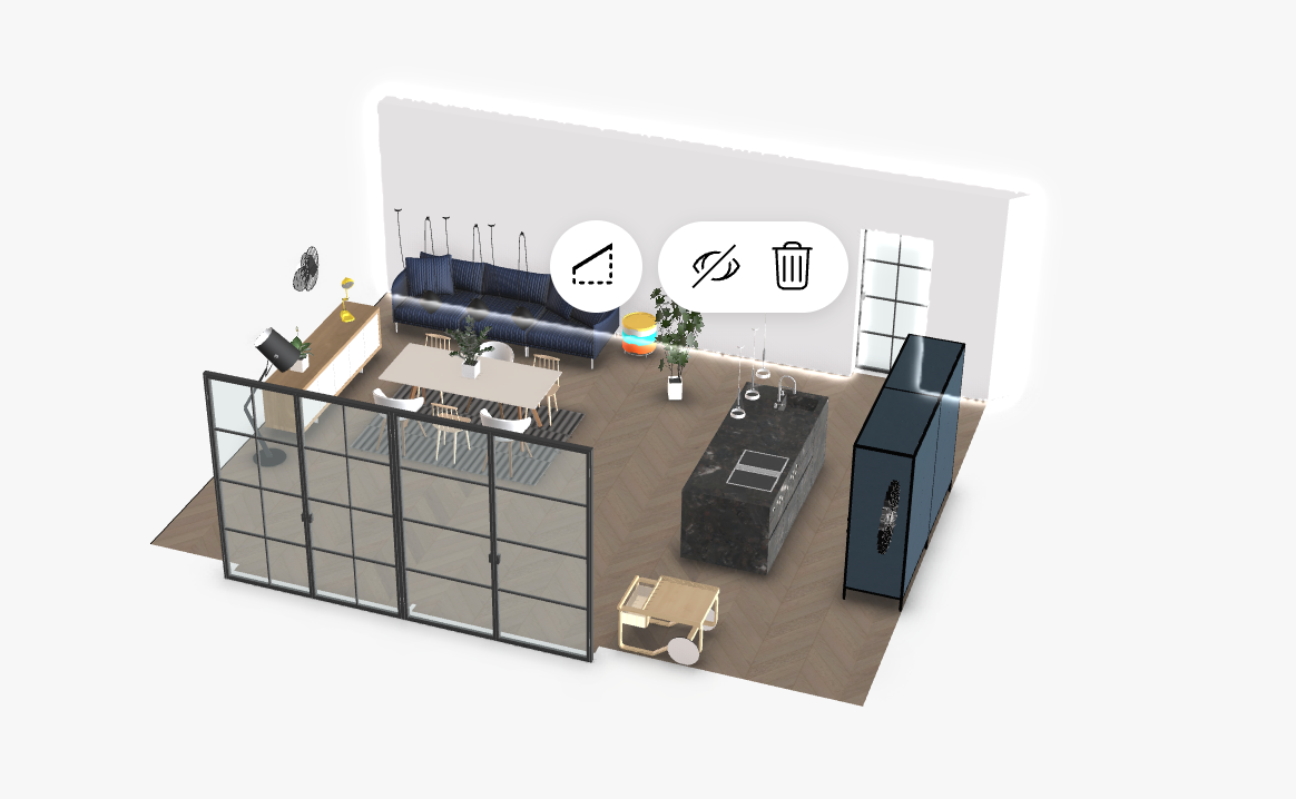 In the past, deleting walls in the room designer scene always led to the case that the corresponding floor of the room got deleted. This has technical reasons. However, there is sometimes the case that a user wants to hide/remove single walls within the room, which is now possible with our latest hide walls feature. Users can now be able to hide single walls within the room designer scene.